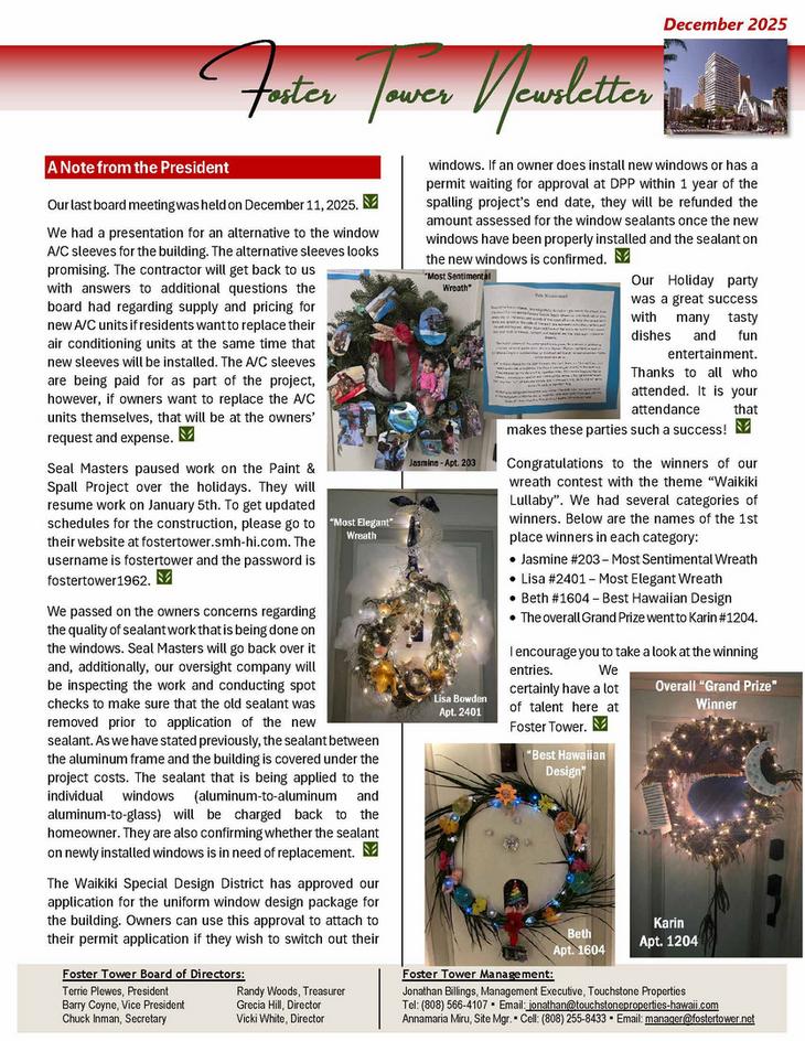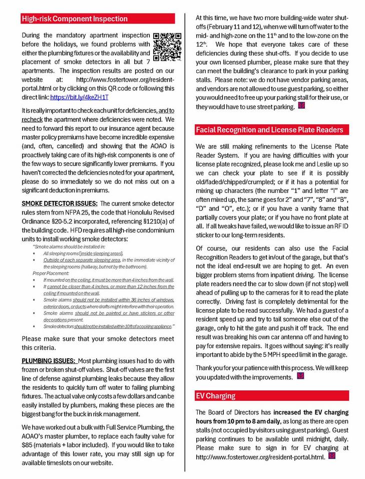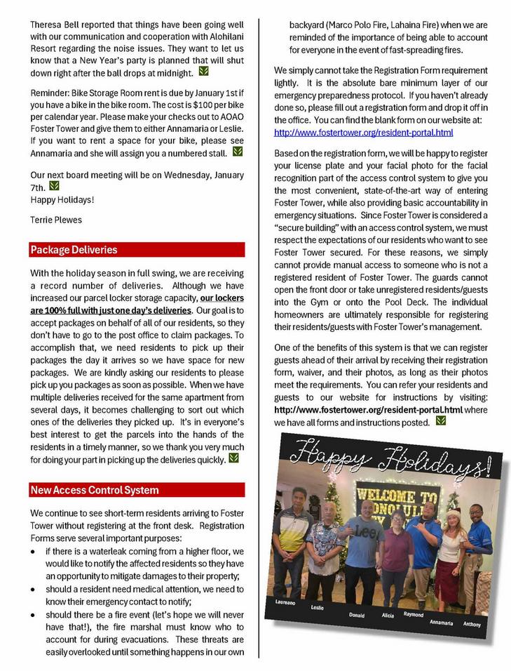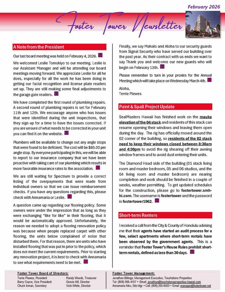 Please remove all items stored in the garage that the House Rules don’t allow for. Our property manager will be back next Wednesday to inspect the common areas. We hope to have no need to issue House Rule Violations when we walk the garage next week. Your cooperation in making Foster Tower the best place to live is always appreciated.