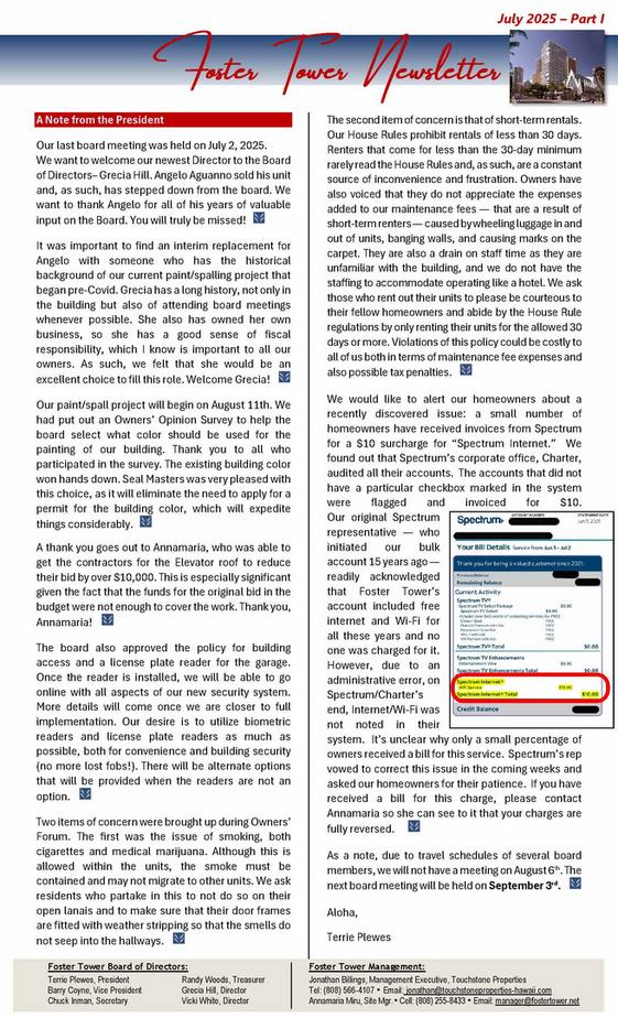 EXTERIOR WINDOW WASHING: Foster Tower's contractor will be at Foster Tower between March 10-12, 2025 (weather permitting) to wash the exterior windows. If you would like your interior windows or mirrors cleaned or your window A/C caulked, you may sign up for this service here: WINDOW WASHING & A/C CAULKING FORM. The contractor will take care of the interior cleaning and A/C caulking on the last day of the 3-day period.